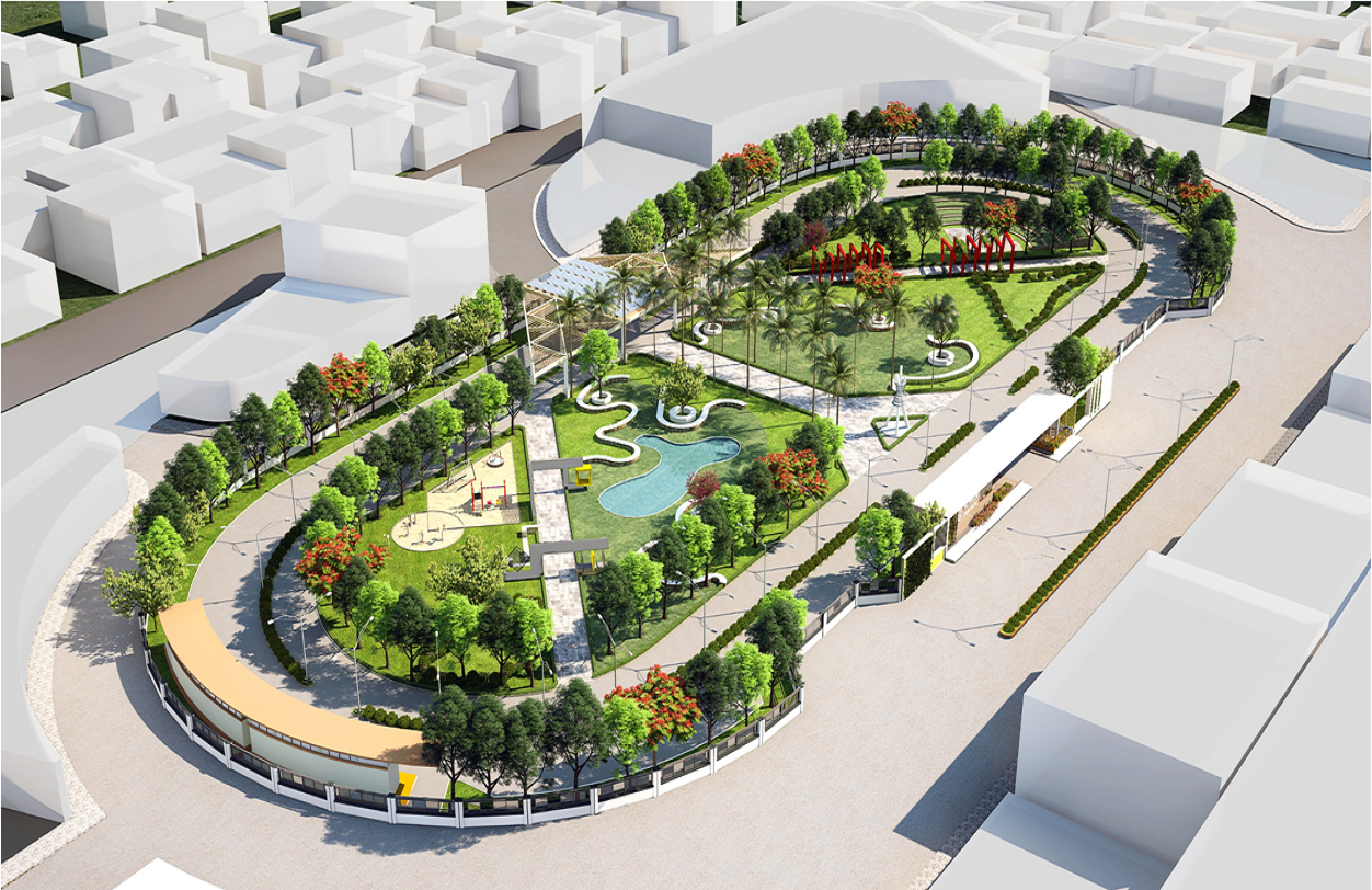 Design Methodology: The design inspiration was taken from luxury city gardens. The recreational space is designed with a 400 m long Jogging Track, an Amphitheatre, a play area for children, informal seating and onsite installation of frames to capture beautiful views and memories. The trees planted are chosen as per the hot and dry climate of Jalgaon and a waterbody is provided in the midst of the landscape to keep the area cool. Various shaded trees near the seating provide a cool and calm space to relax and rewind. Wire Mesh is provided near compound walls for security while ensuring that the visual connectivity between the street and the park is not disturbed. Electricity for the recreational space is solar-generated and produced on the site itself.